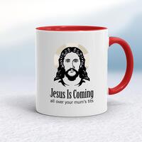 Jesus Is Coming Mug\nA rude mug with "Jesus Is Coming all over your mum’s tits" printed on both sides. Simple and straight to the point this rude mug is great as a gift for any occasion.\nOur Jesus Is Coming mug is hand-printed on both sides (front/back) of a high-quality mug and is available in a variety of styles and colours. \nChoose from A classic ceramic mug in white glossVibrantly coloured inner and matching handle mugsGold or silver sparkling pearl finish mugsGold, silver, pink or blue glitter mugs\n\n\n\nPlease Note\nAll of our items are hand-printed to order, as a result, colours may vary between prints - images are for illustration purposes only.\n