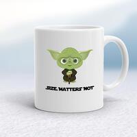 Size Matters Not Mug\nA novelty mug with "Size Matters Not" and a Yoda like graphic printed on both sides. Simple and straight to the point this novelty mug is great as a gift for any occasion.\nOur Size Matters Not mug is hand-printed on both sides (front/back) of a high-quality mug and is available in a variety of styles and colours. \nChoose from A classic ceramic mug in white glossVibrantly coloured inner and matching handle mugsGold or silver sparkling pearl finish mugsGold, silver, pink or blue glitter mugs\n\n\n\nPlease Note\nAll of our items are hand-printed to order, as a result, colours may vary between prints - images are for illustration purposes only.\n