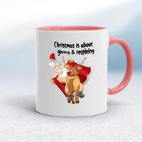 Giving And Receiving Mug\nA rude mug with "Christmas Is About Giving And Receiving" printed on both sides. This fantastic rude Christmas mug is great as a Secret Santa gift or stocking filler.\nOur Giving And Receiving mug is hand-printed on both sides (front/back) of a high-quality mug and is available in a variety of styles and colours. \nChoose from A classic ceramic mug in white glossVibrantly coloured inner and matching handle mugsGold or silver sparkling pearl finish mugsGold, silver, pink or blue glitter mugs\n\n\n\nPlease Note\nAll of our items are hand-printed to order, as a result, colours may vary between prints - images are for illustration purposes only.\n