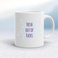 Fresh Out Of Fucks Mug\nA rude mug with "Fresh Out Of Fucks" printed on both sides. Simple and straight to the point this rude mug is great as a gift for any occasion.\nOur Fresh Out Of Fucks mug is hand-printed on both sides (front/back) of a high-quality mug and available in a variety of styles and colours. Choose from A classic ceramic mug in white glossVibrantly coloured inner and matching handle mugsGold or silver sparkling pearl finish mugsGold, silver, pink or blue glitter mugs\n\n\nPlease Note\nAll of our items are hand-printed to order, as a result, colours may vary between prints - images are for illustration purposes only.\n