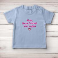 Ruined Your Vagina Baby T-ShirtOur rude baby t-shirt is printed with 'Mum, Sorry I Ruined Your Vagina' and is super snug and ultra comfy.Super soft and stretchy 100% cotton, short sleeve t-shirt with 2 self-coloured poppers at side neck for ease of dressing. Cover stitch at hem and sleeve ends. A perfect gift;ideal for any occasion.Not only will your baby t-shirt be super snug and ultra comfy but you will feel comforted knowing that the processes of manufacturing cotton-based garments have a positive impact on the communities and on the environment in which the Babybugz brand work.Machine washableFabric: 100% Cotton, 200gsm, Interlock weaveSoft and stretchy fabric2 self-coloured poppers at side neckCover stitch at hem and sleeve ends1x1 rib neckSize GuideMeasurements in cm relate to baby's height0/3 mths: 53-60cm 3/6 mths: 60-66cm 6/12 mths: 66-76cm 12/18 mths: 76-86cm 18/24 mths: 86-93cmSee more on our clothing size guide (opens in new tab)\nPlease NoteAll of our items are hand-printed to order, as a result, colours may vary between prints - images are for illustration purposes only.