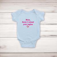 Ruined Your Vagina BabygrowSuper soft and stretchy 100% cotton, short sleeve, babygrow / romper suit / sleepsuit with poppers for ease of dressing. Printed with 'Mum, Sorry I Ruined Your Vagina' across the front of the garment.Machine washableFabric: 100% CottonSize GuideMeasurements in cm relate to baby's height0/3mths: - 53-60cm 3/6mths: - 60-66cm 6/12mths: - 66-76cm See more on our clothing size guide (opens in new tab)Please NoteAll of our items are hand-printed to order, as a result, colours may vary between prints - images are for illustration purposes only.