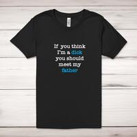 If You Think I'm a Dick Adult T-ShirtA rude unisex adult t-shirt with 'If you think I'm a dick you should meet my ...' choose from either brother or father printed across the front of a 100% cotton* t-shirt. This rude t-shirt is great as a gift for any occasion. Select Design 1 for brother or Design 2 for father, or if you would like anything different please add it to the notes section. All of our unisex adult t-shirts are designed and hand-printed in the UK and are manufactured from 100% ringspun cotton for a premium quality feel and feature double-stitched waist hem and sleeves, seamless double-needle collar, taped neck and shoulders, and a tubular body that has been quarter turned to avoid a centre crease; available in sizes from Extra Small to 4XL*. *Black & White tees available in sizes XS - 4XL, all other colours available XS - 2XL Size GuideUnisex adult t-shirts are measured across the chest, in inchesXS 30/32'S 34/36'M 38/40'L 42/44'XL 46/48'2XL 50/52'3XL 54/56'4XL 58/60'See more on our clothing size guide (opens in new tab)Please NoteAll of our items are hand-printed to order, as a result, colours may vary between prints - images are for illustration purposes only.Show more products with the If You Think I'm a... design