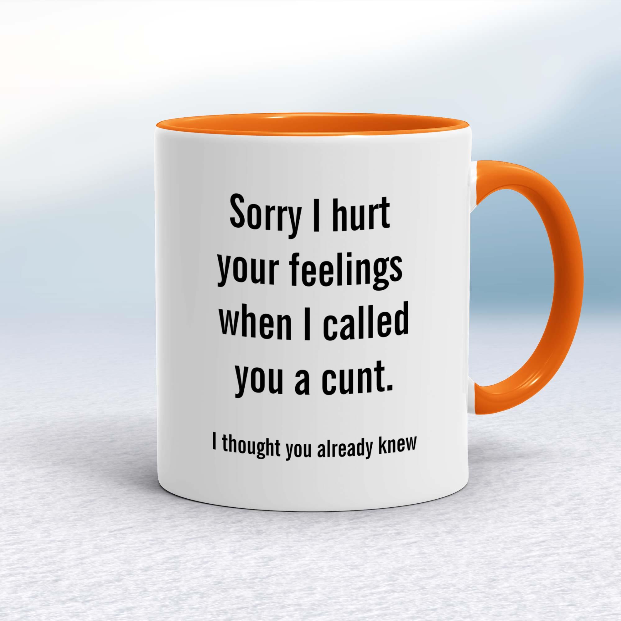 Ruined Your Vagina MugA rude mug with 'Mum, Sorry I Ruined Your Vagina' printed on both sides. Simple and straight to the point this rude mug is great as a gift for any occasion.Our Ruined Your Vagina mug is hand-printed on both sides (front/back) of a high-quality mug and is available in a variety of styles and colours. Choose from A classic ceramic mug in white glossVibrantly coloured inner and matching handle mugsGold or silver sparkling pearl finish mugsGold, silver, pink or blue glitter mugsPremium satin mugs in a choice of colours.Please NoteAll of our items are hand-printed to order, as a result, colours may vary between prints - images are for illustration purposes only.