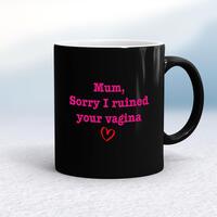 Ruined Your Vagina MugA rude mug with 'Mum, Sorry I Ruined Your Vagina' printed on both sides. Simple and straight to the point this rude mug is great as a gift for any occasion.Our Ruined Your Vagina mug is hand-printed on both sides (front/back) of a high-quality mug and is available in a variety of styles and colours. Choose from A classic ceramic mug in white glossVibrantly coloured inner and matching handle mugsGold or silver sparkling pearl finish mugsGold, silver, pink or blue glitter mugsPremium satin mugs in a choice of colours.Please NoteAll of our items are hand-printed to order, as a result, colours may vary between prints - images are for illustration purposes only.