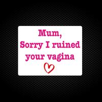 Ruined Your Vagina Vinyl StickerAdd your mark to any car, bike, van, laptop, phone or smooth surface with this rude vinyl decal. Striking, witty and a little bit offensive, our Ruined Your Vagina sticker will look great wherever you chose to place it.The design is CAD cut from glossy display vinyl and adheres permanently* to your vehicle or any flat(ish) surface. Our Ruined Your Vagina decal is cut from display quality vinyl, it's weatherproof, hardwearing, won't fade and will last 3-5 years (if applied correctly).Available SizesA7 approx. 74x105mmA6 approx. 105x148mmA5 approx. 148x210mmA4 approx. 210x297mmA3 approx. 297x420mmA2 approx. 420x594mmYour design will be cut to the maximum dimension possible for the size chosen and dispatched in a hardback envelope to keep it flat or rolled up and sent in a postal tube for larger sizes. Your decals will be ready to apply, with a layer of application tape over the top. Peel off the backing paper, apply the entire sticker with the application tape, give the whole thing a good rub (a credit card works well). Then just gently peel off the application tape; the sticker will stick to the surface and the tape will come away without leaving any residue.*If at a later date you wish to remove the sticker simply heat it gently with an ordinary hair dryer until it peels off. Remove any residue with adhesive remover or rubbing alcohol.Please NoteAll of our items are hand-printed to order, as a result, colours may vary between prints - images are for illustration purposes only.