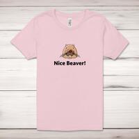 Nice Beaver (Coloured) Adult T-ShirtA novelty adult t-shirt with a cute beaver graphic and 'Nice Beaver!' printed across the front of a 100% cotton* t-shirt. This novelty t-shirt is great as a gift for any occasion.All of our unisex adult t-shirts are designed and hand-printed in the UK and are manufactured from 100% ringspun cotton for a premium quality feel and feature double-stitched waist hem and sleeves, seamless double-needle collar, taped neck and shoulders, and a tubular body that has been quarter turned to avoid a centre crease; available in sizes from Extra Small to 4XL*. *Black & White tees available in sizes XS - 4XL, all other colours available XS - 2XL Size GuideUnisex adult t-shirts are measured across the chest, in inchesXS 30/32'S 34/36'M 38/40'L 42/44'XL 46/48'2XL 50/52'3XL 54/56'4XL 58/60'See more on our clothing size guide (opens in new tab)Please NoteAll of our items are hand-printed to order, as a result, colours may vary between prints - images are for illustration purposes only.Show more products with the Nice Beaver design