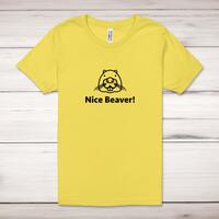 Nice Beaver Adult T-ShirtA novelty adult t-shirt with a cute beaver outline graphic and 'Nice Beaver!' printed across the front of a 100% cotton* t-shirt. This novelty t-shirt is great as a gift for any occasion.All of our unisex adult t-shirts are designed and hand-printed in the UK and are manufactured from 100% ringspun cotton for a premium quality feel and feature double-stitched waist hem and sleeves, seamless double-needle collar, taped neck and shoulders, and a tubular body that has been quarter turned to avoid a centre crease; available in sizes from Extra Small to 4XL*. *Black & White tees available in sizes XS - 4XL, all other colours available XS - 2XL Size GuideUnisex adult t-shirts are measured across the chest, in inchesXS 30/32'S 34/36'M 38/40'L 42/44'XL 46/48'2XL 50/52'3XL 54/56'4XL 58/60'See more on our clothing size guide (opens in new tab)Please NoteAll of our items are hand-printed to order, as a result, colours may vary between prints - images are for illustration purposes only.Show more products with the Nice Beaver design