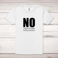 No I Won't Fix Your Fucking Computer Adult T-ShirtA rude unisex adult t-shirt with 'No I Won't Fix Your Fucking Computer' in big, bold lettering printed across the front of a 100% cotton* t-shirt. This rude t-shirt is great as a gift for any occasion.All of our unisex adult t-shirts are designed and hand-printed in the UK and are manufactured from 100% ringspun cotton for a premium quality feel and feature double-stitched waist hem and sleeves, seamless double-needle collar, taped neck and shoulders, and a tubular body that has been quarter turned to avoid a centre crease; available in sizes from Extra Small to 4XL*. *Black & White tees available in sizes XS - 4XL, all other colours available XS - 2XL Size GuideUnisex adult t-shirts are measured across the chest, in inchesXS 30/32'S 34/36'M 38/40'L 42/44'XL 46/48'2XL 50/52'3XL 54/56'4XL 58/60'See more on our clothing size guide (opens in new tab)Please NoteAll of our items are hand-printed to order, as a result, colours may vary between prints - images are for illustration purposes only.Show more products with the No I Won't Fix Your Fucking Computer design