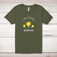 I'm A Fucking Genius Adult T-ShirtA rude unisex adult t-shirt with 'I'm A Fucking Genius' printed across the front of a 100% cotton* t-shirt. This rude t-shirt is great as a gift for any occasion.All of our unisex adult t-shirts are designed and hand-printed in the UK and are manufactured from 100% ringspun cotton for a premium quality feel and feature double-stitched waist hem and sleeves, seamless double-needle collar, taped neck and shoulders, and a tubular body that has been quarter turned to avoid a centre crease; available in sizes from Extra Small to 4XL*. *Black & White tees available in sizes XS - 4XL, all other colours available XS - 2XL Size GuideUnisex adult t-shirts are measured across the chest, in inchesXS 30/32'S 34/36'M 38/40'L 42/44'XL 46/48'2XL 50/52'3XL 54/56'4XL 58/60'See more on our clothing size guide (opens in new tab)Please NoteAll of our items are hand-printed to order, as a result, colours may vary between prints - images are for illustration purposes only.Show more products with the I'm A Fucking… design