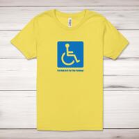 Only In It For The Parking Adult T-ShirtA rude adult t-shirt with a blue disabled badge and the slogan 'I'm Only In It For The Parking' printed across the front of a 100% cotton* t-shirt. This rude t-shirt is great as a gift for any occasion.All of our unisex adult t-shirts are designed and hand-printed in the UK and are manufactured from 100% ringspun cotton for a premium quality feel and feature double-stitched waist hem and sleeves, seamless double-needle collar, taped neck and shoulders, and a tubular body that has been quarter turned to avoid a centre crease; available in sizes from Extra Small to 4XL*. *Black & White tees available in sizes XS - 4XL, all other colours available XS - 2XL Size GuideUnisex adult t-shirts are measured across the chest, in inchesXS 30/32'S 34/36'M 38/40'L 42/44'XL 46/48'2XL 50/52'3XL 54/56'4XL 58/60'See more on our clothing size guide (opens in new tab)Please NoteAll of our items are hand-printed to order, as a result, colours may vary between prints - images are for illustration purposes only.Show more products with the Only In It For The Parking design