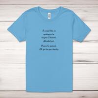 Apologies To Anyone I Haven't Offended Yet Adult T-ShirtA novelty unisex adult t-shirt with 'I would like to apologise to anyone I haven't offended yet. Please be patient, I'll get to you shortly.' printed across the front of a 100% cotton* t-shirt. This novelty t-shirt is great as a gift for any occasion.All of our unisex adult t-shirts are designed and hand-printed in the UK and are manufactured from 100% ringspun cotton for a premium quality feel and feature double-stitched waist hem and sleeves, seamless double-needle collar, taped neck and shoulders, and a tubular body that has been quarter turned to avoid a centre crease; available in sizes from Extra Small to 4XL*. *Black & White tees available in sizes XS - 4XL, all other colours available XS - 2XL Size GuideUnisex adult t-shirts are measured across the chest, in inchesXS 30/32'S 34/36'M 38/40'L 42/44'XL 46/48'2XL 50/52'3XL 54/56'4XL 58/60'See more on our clothing size guide (opens in new tab)Please NoteAll of our items are hand-printed to order, as a result, colours may vary between prints - images are for illustration purposes only.Show more products with the Apologies To Anyone I Haven't Offended Yet design