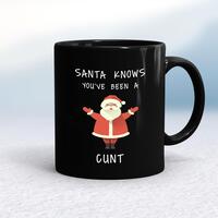 Santa Knows You've Been A Cunt MugA rude mug with 'Santa Knows You've Been A Cunt' printed on both sides. Simple and straight to the point this rude mug is great as a gift for any occasion.Our Santa Knows You've Been A Cunt mug is hand-printed on both sides (front/back) of a high-quality mug and available in a variety of styles and colours. Choose from A classic ceramic mug in white glossVibrantly coloured inner and matching handle mugsGold or silver sparkling pearl finish mugsGold, silver, pink or blue glitter mugsPremium satin mugs in a choice of colours.Please NoteAll of our items are hand-printed to order, as a result, colours may vary between prints - images are for illustration purposes only.