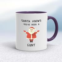 Santa Knows You've Been A Cunt MugA rude mug with 'Santa Knows You've Been A Cunt' printed on both sides. Simple and straight to the point this rude mug is great as a gift for any occasion.Our Santa Knows You've Been A Cunt mug is hand-printed on both sides (front/back) of a high-quality mug and available in a variety of styles and colours. Choose from A classic ceramic mug in white glossVibrantly coloured inner and matching handle mugsGold or silver sparkling pearl finish mugsGold, silver, pink or blue glitter mugsPremium satin mugs in a choice of colours.Please NoteAll of our items are hand-printed to order, as a result, colours may vary between prints - images are for illustration purposes only.