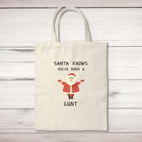 Santa Knows You've Been A Cunt Tote BagA rude shopping bag with 'Santa Knows You've Been A Cunt' printed on the front of a 100% cotton tote bag. This rude bag is a perfect replacement for plastic bags in retail, supermarkets and any other kinds of stores. Reusable, sustainable and multifunctional. 100% 150gsm Cotton10 litre capacity38 x 42 cmLong handled shopper, for easy use over the shoulderAvailable in a range of coloursDesigned and hand-printed in the UKPlease NoteAll of our items are hand-printed to order, as a result, colours may vary between prints - images are for illustration purposes only.