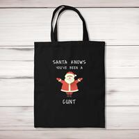 Santa Knows You've Been A Cunt Tote BagA rude shopping bag with 'Santa Knows You've Been A Cunt' printed on the front of a 100% cotton tote bag. This rude bag is a perfect replacement for plastic bags in retail, supermarkets and any other kinds of stores. Reusable, sustainable and multifunctional. 100% 150gsm Cotton10 litre capacity38 x 42 cmLong handled shopper, for easy use over the shoulderAvailable in a range of coloursDesigned and hand-printed in the UKPlease NoteAll of our items are hand-printed to order, as a result, colours may vary between prints - images are for illustration purposes only.