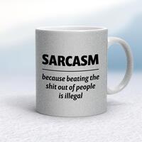 Sarcasm Because MugA rude mug with 'Sarcasm because beating the shit out of people is illegal' printed on both sides. Simple and straight to the point this rude mug is great as a gift for any occasion.Our Sarcasm Because mug is hand-printed on both sides (front/back) of a high-quality mug and is available in a variety of styles and colours. Choose from A classic ceramic mug in white glossVibrantly coloured inner and matching handle mugsGold or silver sparkling pearl finish mugsGold, silver, pink or blue glitter mugsPremium satin mugs in a choice of colours.Please NoteAll of our items are hand-printed to order, as a result, colours may vary between prints - images are for illustration purposes only.