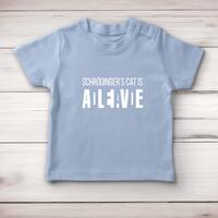 Schrodinger's Cat Baby T-ShirtOur geeky baby t-shirt is printed with 'Schrodinger's Cat Is Dead or Alive' and is super snug and ultra comfy.Super soft and stretchy 100% cotton, short sleeve t-shirt with 2 self-coloured poppers at side neck for ease of dressing. Cover stitch at hem and sleeve ends. A perfect gift;ideal for any occasion.Not only will your baby t-shirt be super snug and ultra comfy but you will feel comforted knowing that the processes of manufacturing cotton-based garments have a positive impact on the communities and on the environment in which the Babybugz brand work.Machine washableFabric: 100% Cotton, 200gsm, Interlock weaveSoft and stretchy fabric2 self-coloured poppers at side neckCover stitch at hem and sleeve ends1x1 rib neckSize GuideMeasurements in cm relate to baby's height0/3 mths: 53-60cm 3/6 mths: 60-66cm 6/12 mths: 66-76cm 12/18 mths: 76-86cm 18/24 mths: 86-93cmSee more on our clothing size guide (opens in new tab)\nPlease NoteAll of our items are hand-printed to order, as a result, colours may vary between prints - images are for illustration purposes only.