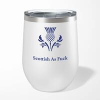 Scottish As Fuck Wine TumblerOur Scottish As Fuck 12oz tumbler is hand-printed with 'Scottish As Fuck' on both sides (front/back) of an insulated stainless steel wine tumbler and available in a variety of colours.Ideal for weekends away or relaxing in the garden, our 12oz Wine Tumbler promises to keep cold drinks cold and hot drinks hot for longer than standard drinkware. Made from premium grade, food-safe stainless steel with double-wall vacuum insulation. A fantastic rude tumbler, ideal for keeping your favourite tipple at the perfect temperature whatever the weather. High-grade stainless steel double-wall construction. Insulated for hot or cold liquids. Flat bottom design means less risk of accidental spillages. See through lid allows you to carry your beverage around without spilling. Drinking spout incorporated in to the lid. Please Note All of our items are hand-printed to order, as a result, colours may vary between prints - images are for illustration purposes only.