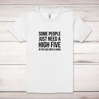 Some People Just Need A High Five Adult T-ShirtA novelty unisex adult t-shirt with 'Some People Just Need A High Five In The Face With A Chair' printed across the front of a 100% cotton* t-shirt. This novelty t-shirt is great as a gift for any occasion.All of our unisex adult t-shirts are designed and hand-printed in the UK and are manufactured from 100% ringspun cotton for a premium quality feel and feature double-stitched waist hem and sleeves, seamless double-needle collar, taped neck and shoulders, and a tubular body that has been quarter turned to avoid a centre crease; available in sizes from Extra Small to 4XL*. *Black & White tees available in sizes XS - 4XL, all other colours available XS - 2XL Size GuideUnisex adult t-shirts are measured across the chest, in inchesXS 30/32'S 34/36'M 38/40'L 42/44'XL 46/48'2XL 50/52'3XL 54/56'4XL 58/60'See more on our clothing size guide (opens in new tab)Please NoteAll of our items are hand-printed to order, as a result, colours may vary between prints - images are for illustration purposes only.Show more products with the Some People Just Need A High Five design