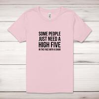 Some People Just Need A High Five Adult T-ShirtA novelty unisex adult t-shirt with 'Some People Just Need A High Five In The Face With A Chair' printed across the front of a 100% cotton* t-shirt. This novelty t-shirt is great as a gift for any occasion.All of our unisex adult t-shirts are designed and hand-printed in the UK and are manufactured from 100% ringspun cotton for a premium quality feel and feature double-stitched waist hem and sleeves, seamless double-needle collar, taped neck and shoulders, and a tubular body that has been quarter turned to avoid a centre crease; available in sizes from Extra Small to 4XL*. *Black & White tees available in sizes XS - 4XL, all other colours available XS - 2XL Size GuideUnisex adult t-shirts are measured across the chest, in inchesXS 30/32'S 34/36'M 38/40'L 42/44'XL 46/48'2XL 50/52'3XL 54/56'4XL 58/60'See more on our clothing size guide (opens in new tab)Please NoteAll of our items are hand-printed to order, as a result, colours may vary between prints - images are for illustration purposes only.Show more products with the Some People Just Need A High Five design