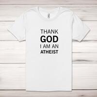Thank God I'm An Atheist Adult T-ShirtA rude unisex adult t-shirt with 'Thank God I'm An Atheist' printed across the front of a 100% cotton* t-shirt. This rude t-shirt is great as a gift for any occasion.All of our unisex adult t-shirts are designed and hand-printed in the UK and are manufactured from 100% ringspun cotton for a premium quality feel and feature double-stitched waist hem and sleeves, seamless double-needle collar, taped neck and shoulders, and a tubular body that has been quarter turned to avoid a centre crease; available in sizes from Extra Small to 4XL*. *Black & White tees available in sizes XS - 4XL, all other colours available XS - 2XL Size GuideUnisex adult t-shirts are measured across the chest, in inchesXS 30/32'S 34/36'M 38/40'L 42/44'XL 46/48'2XL 50/52'3XL 54/56'4XL 58/60'See more on our clothing size guide (opens in new tab)Please NoteAll of our items are hand-printed to order, as a result, colours may vary between prints - images are for illustration purposes only.Show more products with the Thank God I'm An Atheist design