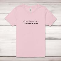 Cock Gobbling Thundercunt Adult T-ShirtA rude unisex adult t-shirt with 'Cock Gobbling Thundercunt' printed across the front of a 100% cotton* t-shirt. This rude t-shirt is great as a gift for any occasion.All of our unisex adult t-shirts are designed and hand-printed in the UK and are manufactured from 100% ringspun cotton for a premium quality feel and feature double-stitched waist hem and sleeves, seamless double-needle collar, taped neck and shoulders, and a tubular body that has been quarter turned to avoid a centre crease; available in sizes from Extra Small to 4XL*. *Black & White tees available in sizes XS - 4XL, all other colours available XS - 2XL Size GuideUnisex adult t-shirts are measured across the chest, in inchesXS 30/32'S 34/36'M 38/40'L 42/44'XL 46/48'2XL 50/52'3XL 54/56'4XL 58/60'See more on our clothing size guide (opens in new tab)Please NoteAll of our items are hand-printed to order, as a result, colours may vary between prints - images are for illustration purposes only.Show more products with the Cock Gobbling Thundercunt design