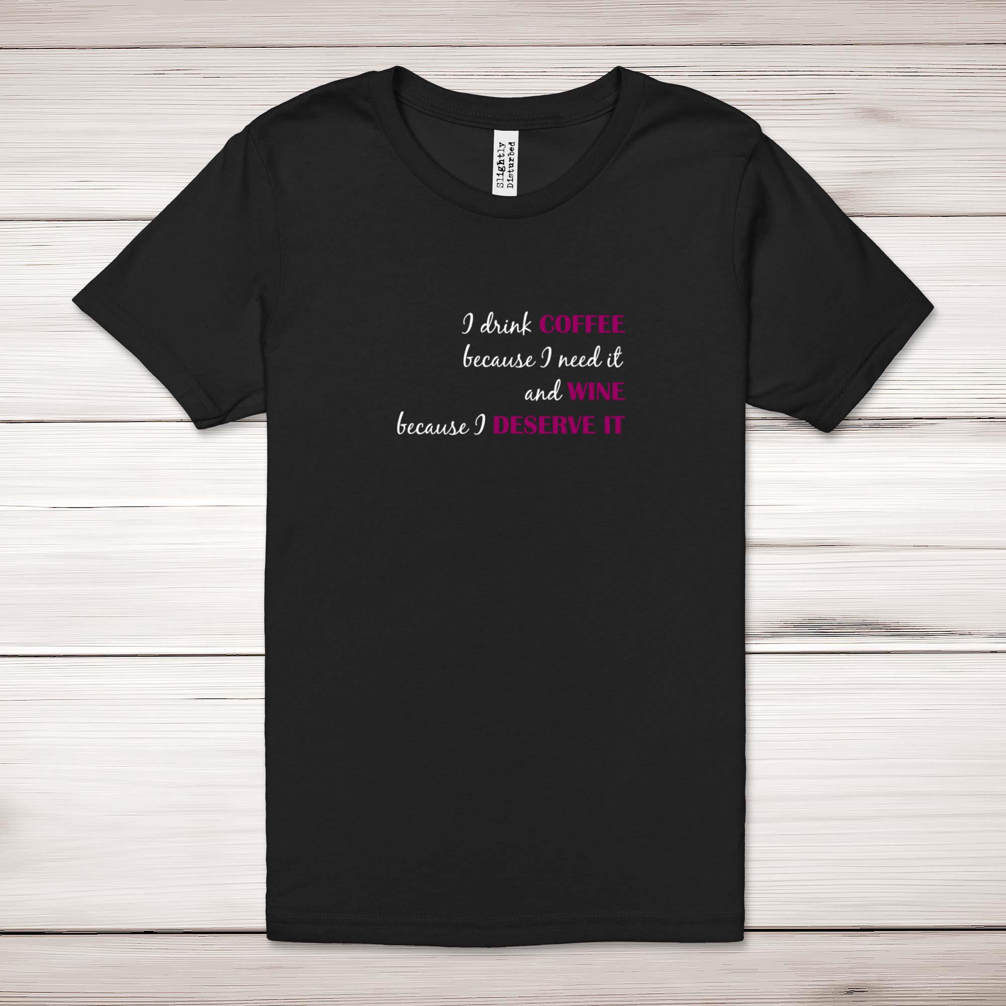 Coffee Because I Need It, Wine Because I Deserve It Adult T-Shirt - Black, Small