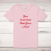 Your Secret Santa Adult T-ShirtA rude unisex adult t-shirt with 'Your Secret Santa Thinks You're A Cunt' printed across the front of a 100% cotton* t-shirt. This rude t-shirt is great as a gift for any occasion.All of our unisex adult t-shirts are designed and hand-printed in the UK and are manufactured from 100% ringspun cotton for a premium quality feel and feature double-stitched waist hem and sleeves, seamless double-needle collar, taped neck and shoulders, and a tubular body that has been quarter turned to avoid a centre crease; available in sizes from Extra Small to 4XL*. *Black & White tees available in sizes XS - 4XL, all other colours available XS - 2XL Size GuideUnisex adult t-shirts are measured across the chest, in inchesXS 30/32'S 34/36'M 38/40'L 42/44'XL 46/48'2XL 50/52'3XL 54/56'4XL 58/60'See more on our clothing size guide (opens in new tab)Please NoteAll of our items are hand-printed to order, as a result, colours may vary between prints - images are for illustration purposes only.Show more products with the Your Secret Santa design