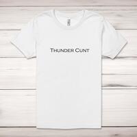 Thunder Cunt Adult T-ShirtA rude unisex adult t-shirt with 'Thunder Cunt' printed across the front of a 100% cotton* t-shirt. This rude t-shirt is great as a gift for any occasion.All of our unisex adult t-shirts are designed and hand-printed in the UK and are manufactured from 100% ringspun cotton for a premium quality feel and feature double-stitched waist hem and sleeves, seamless double-needle collar, taped neck and shoulders, and a tubular body that has been quarter turned to avoid a centre crease; available in sizes from Extra Small to 4XL*. *Black & White tees available in sizes XS - 4XL, all other colours available XS - 2XL Size GuideUnisex adult t-shirts are measured across the chest, in inchesXS 30/32'S 34/36'M 38/40'L 42/44'XL 46/48'2XL 50/52'3XL 54/56'4XL 58/60'See more on our clothing size guide (opens in new tab)Please NoteAll of our items are hand-printed to order, as a result, colours may vary between prints - images are for illustration purposes only.Show more products with the Thunder Cunt design