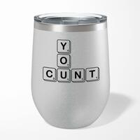 Scrabble Tiles You Cunt Wine TumblerOur Scrabble Tiles You Cunt 12oz tumbler is hand-printed with 'Scrabble Tiles You Cunt' on both sides (front/back) of an insulated stainless steel wine tumbler and available in a variety of colours.Ideal for weekends away or relaxing in the garden, our 12oz Wine Tumbler promises to keep cold drinks cold and hot drinks hot for longer than standard drinkware. Made from premium grade, food-safe stainless steel with double-wall vacuum insulation. A fantastic rude tumbler, ideal for keeping your favourite tipple at the perfect temperature whatever the weather. High-grade stainless steel double-wall construction. Insulated for hot or cold liquids. Flat bottom design means less risk of accidental spillages. See through lid allows you to carry your beverage around without spilling. Drinking spout incorporated in to the lid. Please Note All of our items are hand-printed to order, as a result, colours may vary between prints - images are for illustration purposes only.