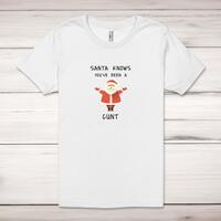 Santa Knows You've Been A Cunt Adult T-ShirtA rude unisex adult t-shirt with 'Santa Knows You've Been A Cunt' printed across the front of a 100% cotton* t-shirt. This rude t-shirt is great as a gift for any occasion.All of our unisex adult t-shirts are designed and hand-printed in the UK and are manufactured from 100% ringspun cotton for a premium quality feel and feature double-stitched waist hem and sleeves, seamless double-needle collar, taped neck and shoulders, and a tubular body that has been quarter turned to avoid a centre crease; available in sizes from Extra Small to 4XL*. *Black & White tees available in sizes XS - 4XL, all other colours available XS - 2XL Size GuideUnisex adult t-shirts are measured across the chest, in inchesXS 30/32'S 34/36'M 38/40'L 42/44'XL 46/48'2XL 50/52'3XL 54/56'4XL 58/60'See more on our clothing size guide (opens in new tab)Please NoteAll of our items are hand-printed to order, as a result, colours may vary between prints - images are for illustration purposes only.Show more products with the Santa Knows design