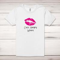Cock Hungry Whore Adult T-ShirtA rude unisex adult t-shirt with 'Cock Hungry Whore' printed across the front of a 100% cotton* t-shirt. This rude t-shirt is great as a gift for any occasion.All of our unisex adult t-shirts are designed and hand-printed in the UK and are manufactured from 100% ringspun cotton for a premium quality feel and feature double-stitched waist hem and sleeves, seamless double-needle collar, taped neck and shoulders, and a tubular body that has been quarter turned to avoid a centre crease; available in sizes from Extra Small to 4XL*. *Black & White tees available in sizes XS - 4XL, all other colours available XS - 2XL Size GuideUnisex adult t-shirts are measured across the chest, in inchesXS 30/32'S 34/36'M 38/40'L 42/44'XL 46/48'2XL 50/52'3XL 54/56'4XL 58/60'See more on our clothing size guide (opens in new tab)Please NoteAll of our items are hand-printed to order, as a result, colours may vary between prints - images are for illustration purposes only.Show more products with the Cock Hungry Whore design