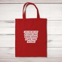 Secret Santa - Everyone Thinks I'm A Cunt Tote BagA rude shopping bag with 'Secret Santa - Everyone Thinks I'm A Cunt' printed on the front of a 100% cotton tote bag. This rude bag is a perfect replacement for plastic bags in retail, supermarkets and any other kinds of stores. Reusable, sustainable and multifunctional. 100% 150gsm Cotton10 litre capacity38 x 42 cmLong handled shopper, for easy use over the shoulderAvailable in a range of coloursDesigned and hand-printed in the UKPlease NoteAll of our items are hand-printed to order, as a result, colours may vary between prints - images are for illustration purposes only.