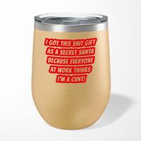 Secret Santa - Everyone Thinks I'm A Cunt Wine TumblerOur Secret Santa - Everyone Thinks I'm A Cunt 12oz tumbler is hand-printed with 'Secret Santa - Everyone Thinks I'm A Cunt' on both sides (front/back) of an insulated stainless steel wine tumbler and available in a variety of colours.Ideal for weekends away or relaxing in the garden, our 12oz Wine Tumbler promises to keep cold drinks cold and hot drinks hot for longer than standard drinkware. Made from premium grade, food-safe stainless steel with double-wall vacuum insulation. A fantastic rude tumbler, ideal for keeping your favourite tipple at the perfect temperature whatever the weather. High-grade stainless steel double-wall construction. Insulated for hot or cold liquids. Flat bottom design means less risk of accidental spillages. See through lid allows you to carry your beverage around without spilling. Drinking spout incorporated in to the lid. Please Note All of our items are hand-printed to order, as a result, colours may vary between prints - images are for illustration purposes only.