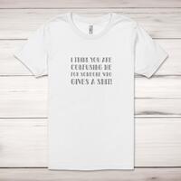 Someone Who Gives A Shit Adult T-ShirtA rude unisex adult t-shirt with 'I think you are confusing me for someone who gives a shit!' printed across the front of a 100% cotton* t-shirt. This rude t-shirt is great as a gift for any occasion.All of our unisex adult t-shirts are designed and hand-printed in the UK and are manufactured from 100% ringspun cotton for a premium quality feel and feature double-stitched waist hem and sleeves, seamless double-needle collar, taped neck and shoulders, and a tubular body that has been quarter turned to avoid a centre crease; available in sizes from Extra Small to 4XL*. *Black & White tees available in sizes XS - 4XL, all other colours available XS - 2XL Size GuideUnisex adult t-shirts are measured across the chest, in inchesXS 30/32'S 34/36'M 38/40'L 42/44'XL 46/48'2XL 50/52'3XL 54/56'4XL 58/60'See more on our clothing size guide (opens in new tab)Please NoteAll of our items are hand-printed to order, as a result, colours may vary between prints - images are for illustration purposes only.Show more products with the Someone Who Gives A Shit design