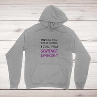 Sentence Enhancers HoodieA novelty hoodie with 'You Call Then Swear Words, I Call Them Sentence Enhancers!' printed on the front of a unisex pullover hooded sweatshirt. Simple and straight to the point this novelty hoodie is great as a gift for any occasion.Comfortable and cosy, this hoodie manages to be both warm and cool. The super soft feel and plush fabric is definitely something you’ll want to warm up to. All of our garments are designed and hand-printed in the UK and are manufactured from preshrunk fleece knit and features a double-lined hood, and colour-matched drawcord, pouch pocket and a tubular body that has been quarter turned to avoid a centre crease; available in sizes small to 5XL. Classic fit Preshrunk fleece knit Air jet yarn = softer feel and reduced pilling Double-lined hood with colour-matched drawcord Pouch pocket Twin-needle stitching at shoulder, armhole, neck, waistband and cuffs 1 x 1 rib with elastane Quarter-turned to eliminate centre crease Material Weight 271gsm 50% Cotton / 50% PolyesterSize Guidemeasured across the chest S 34/36' M 38/40' L 42/44' XL 46/48' 2XL 50/52' 3XL 54/56' 4XL 58/60' 5XL 62/64'See more on our clothing size guide (opens in new tab) Please Note All of our items are hand-printed to order, as a result, colours may vary between prints - images are for illustration purposes only.
