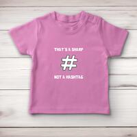 Sharp Not Hashtag Baby T-ShirtOur novelty baby t-shirt is printed with 'That's A Sharp Not A Hashtag' and is super snug and ultra comfy.Super soft and stretchy 100% cotton, short sleeve t-shirt with 2 self-coloured poppers at side neck for ease of dressing. Cover stitch at hem and sleeve ends. A perfect gift;ideal for any occasion.Not only will your baby t-shirt be super snug and ultra comfy but you will feel comforted knowing that the processes of manufacturing cotton-based garments have a positive impact on the communities and on the environment in which the Babybugz brand work.Machine washableFabric: 100% Cotton, 200gsm, Interlock weaveSoft and stretchy fabric2 self-coloured poppers at side neckCover stitch at hem and sleeve ends1x1 rib neckSize GuideMeasurements in cm relate to baby's height0/3 mths: 53-60cm 3/6 mths: 60-66cm 6/12 mths: 66-76cm 12/18 mths: 76-86cm 18/24 mths: 86-93cmSee more on our clothing size guide (opens in new tab)\nPlease NoteAll of our items are hand-printed to order, as a result, colours may vary between prints - images are for illustration purposes only.