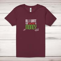 All I Want For Christmas Is Money Adult T-ShirtA novelty unisex adult t-shirt with 'All I Want For Christmas Is Money' printed across the front of a 100% cotton* t-shirt. This novelty t-shirt is great as a gift for any occasion.All of our unisex adult t-shirts are designed and hand-printed in the UK and are manufactured from 100% ringspun cotton for a premium quality feel and feature double-stitched waist hem and sleeves, seamless double-needle collar, taped neck and shoulders, and a tubular body that has been quarter turned to avoid a centre crease; available in sizes from Extra Small to 4XL*. *Black & White tees available in sizes XS - 4XL, all other colours available XS - 2XL Size GuideUnisex adult t-shirts are measured across the chest, in inchesXS 30/32'S 34/36'M 38/40'L 42/44'XL 46/48'2XL 50/52'3XL 54/56'4XL 58/60'See more on our clothing size guide (opens in new tab)Please NoteAll of our items are hand-printed to order, as a result, colours may vary between prints - images are for illustration purposes only.Show more products with the All I Want For Christmas design