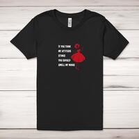 Attitude Stinks Adult T-ShirtA fantastic, rude, 100% cotton* ladies t-shirt with If You Think My Attitude Stinks You Should Smell My Minge printed across the front. Simple and straight to the point this rude t-shirt is great as a gift for any occasion.All of our unisex adult t-shirts are designed and hand-printed in the UK. This well-tailored t-shirt is made of heavyweight cotton, has a feminine rib scoop neck, nearly cap sleeves, and a side seam featuring a slightly tapered fit to hug your curves in all the right places. Manufactured from 100% preshrunk cotton jersey fabric and feature double-stitched waist hem and sleeves, seamless double-needle collar, taped neck and shoulders, and a tubular body that has been quarter turned to avoid a centre crease; available in sizes from Small to XL.Size GuideXS 30/32'S 34/36'M 38/40'L 42/44'XL 46/48'2XL 50/52'3XL 54/56'4XL 58/60'See more on our clothing size guide (opens in new tab)Please NoteAll of our items are hand-printed to order, as a result, colours may vary between prints - images are for illustration purposes only.Show more products with the Attitude Stinks design