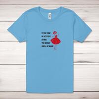 Attitude Stinks Adult T-ShirtA fantastic, rude, 100% cotton* ladies t-shirt with If You Think My Attitude Stinks You Should Smell My Minge printed across the front. Simple and straight to the point this rude t-shirt is great as a gift for any occasion.All of our unisex adult t-shirts are designed and hand-printed in the UK. This well-tailored t-shirt is made of heavyweight cotton, has a feminine rib scoop neck, nearly cap sleeves, and a side seam featuring a slightly tapered fit to hug your curves in all the right places. Manufactured from 100% preshrunk cotton jersey fabric and feature double-stitched waist hem and sleeves, seamless double-needle collar, taped neck and shoulders, and a tubular body that has been quarter turned to avoid a centre crease; available in sizes from Small to XL.Size GuideXS 30/32'S 34/36'M 38/40'L 42/44'XL 46/48'2XL 50/52'3XL 54/56'4XL 58/60'See more on our clothing size guide (opens in new tab)Please NoteAll of our items are hand-printed to order, as a result, colours may vary between prints - images are for illustration purposes only.Show more products with the Attitude Stinks design