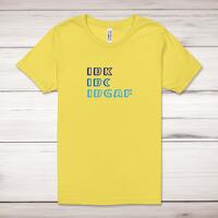 IDGAF Adult T-ShirtA novelty unisex adult t-shirt with 'IDK, IDC, IDGAF' printed across the front of a 100% cotton* t-shirt. This novelty t-shirt is great as a gift for any occasion.All of our unisex adult t-shirts are designed and hand-printed in the UK and are manufactured from 100% ringspun cotton for a premium quality feel and feature double-stitched waist hem and sleeves, seamless double-needle collar, taped neck and shoulders, and a tubular body that has been quarter turned to avoid a centre crease; available in sizes from Extra Small to 4XL*. *Black & White tees available in sizes XS - 4XL, all other colours available XS - 2XL Size GuideUnisex adult t-shirts are measured across the chest, in inchesXS 30/32'S 34/36'M 38/40'L 42/44'XL 46/48'2XL 50/52'3XL 54/56'4XL 58/60'See more on our clothing size guide (opens in new tab)Please NoteAll of our items are hand-printed to order, as a result, colours may vary between prints - images are for illustration purposes only.Show more products with the IDGAF design