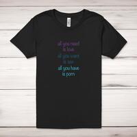 All You Need Is Love, All You Have Is Porn Adult T-ShirtA rude unisex adult t-shirt with 'All You Need Is Love. All You Want Is Sex, All You Have Is Porn' printed across the front of a 100% cotton* t-shirt. This rude t-shirt is great as a gift for any occasion.All of our unisex adult t-shirts are designed and hand-printed in the UK and are manufactured from 100% ringspun cotton for a premium quality feel and feature double-stitched waist hem and sleeves, seamless double-needle collar, taped neck and shoulders, and a tubular body that has been quarter turned to avoid a centre crease; available in sizes from Extra Small to 4XL*. *Black & White tees available in sizes XS - 4XL, all other colours available XS - 2XL Size GuideUnisex adult t-shirts are measured across the chest, in inchesXS 30/32'S 34/36'M 38/40'L 42/44'XL 46/48'2XL 50/52'3XL 54/56'4XL 58/60'See more on our clothing size guide (opens in new tab)Please NoteAll of our items are hand-printed to order, as a result, colours may vary between prints - images are for illustration purposes only.Show more products with the All You Need Is Love design
