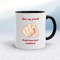 Should Have Been Swallowed MugA rude mug with 'You, My Friend Should Have Been Swallowed' printed on both sides. Simple and straight to the point this rude mug is great as a gift for any occasion.Our Should Have Been Swallowed mug is hand-printed on both sides (front/back) of a high-quality mug and is available in a variety of styles and colours. Choose from A classic ceramic mug in white glossVibrantly coloured inner and matching handle mugsGold or silver sparkling pearl finish mugsGold, silver, pink or blue glitter mugsPremium satin mugs in a choice of colours.Please NoteAll of our items are hand-printed to order, as a result, colours may vary between prints - images are for illustration purposes only.