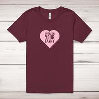 I've Seen Your Fanny Adult T-ShirtA rude unisex adult t-shirt with 'I've Seen Your Fanny' printed across the front of a 100% cotton* t-shirt. This rude t-shirt is great as a gift for any occasion.All of our unisex adult t-shirts are designed and hand-printed in the UK and are manufactured from 100% ringspun cotton for a premium quality feel and feature double-stitched waist hem and sleeves, seamless double-needle collar, taped neck and shoulders, and a tubular body that has been quarter turned to avoid a centre crease; available in sizes from Extra Small to 4XL*. *Black & White tees available in sizes XS - 4XL, all other colours available XS - 2XL Size GuideUnisex adult t-shirts are measured across the chest, in inchesXS 30/32'S 34/36'M 38/40'L 42/44'XL 46/48'2XL 50/52'3XL 54/56'4XL 58/60'See more on our clothing size guide (opens in new tab)Please NoteAll of our items are hand-printed to order, as a result, colours may vary between prints - images are for illustration purposes only.Show more products with the I've Seen Your design