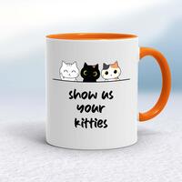 Show Us Your Kitties MugA novelty mug with 'Show Us Your Kitties' printed on both sides. Simple and straight to the point this novelty mug is great as a gift for any occasion.Our Show Us Your Kitties mug is hand-printed on both sides (front/back) of a high-quality mug and available in a variety of styles and colours. Choose from A classic ceramic mug in white glossVibrantly coloured inner and matching handle mugsGold or silver sparkling pearl finish mugsGold, silver, pink or blue glitter mugsPremium satin mugs in a choice of colours.Please NoteAll of our items are hand-printed to order, as a result, colours may vary between prints - images are for illustration purposes only.