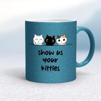 Show Us Your Kitties MugA novelty mug with 'Show Us Your Kitties' printed on both sides. Simple and straight to the point this novelty mug is great as a gift for any occasion.Our Show Us Your Kitties mug is hand-printed on both sides (front/back) of a high-quality mug and available in a variety of styles and colours. Choose from A classic ceramic mug in white glossVibrantly coloured inner and matching handle mugsGold or silver sparkling pearl finish mugsGold, silver, pink or blue glitter mugsPremium satin mugs in a choice of colours.Please NoteAll of our items are hand-printed to order, as a result, colours may vary between prints - images are for illustration purposes only.