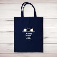 Show Us Your Kitties Tote BagA novelty shopping bag with 'Show Us Your Kitties' printed on the front of a 100% cotton tote bag. This novelty bag is a perfect replacement for plastic bags in retail, supermarkets and any other kinds of stores. Reusable, sustainable and multifunctional. 100% 150gsm Cotton10 litre capacity38 x 42 cmLong handled shopper, for easy use over the shoulderAvailable in a range of coloursDesigned and hand-printed in the UKPlease NoteAll of our items are hand-printed to order, as a result, colours may vary between prints - images are for illustration purposes only.