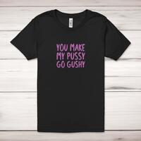 You Make My Pussy Go Gushy Adult T-ShirtA rude unisex adult t-shirt with 'You Make My Pussy Go Gushy' printed across the front of a 100% cotton* t-shirt. This rude t-shirt is great as a gift for any occasion.All of our unisex adult t-shirts are designed and hand-printed in the UK and are manufactured from 100% ringspun cotton for a premium quality feel and feature double-stitched waist hem and sleeves, seamless double-needle collar, taped neck and shoulders, and a tubular body that has been quarter turned to avoid a centre crease; available in sizes from Extra Small to 4XL*. *Black & White tees available in sizes XS - 4XL, all other colours available XS - 2XL Size GuideUnisex adult t-shirts are measured across the chest, in inchesXS 30/32'S 34/36'M 38/40'L 42/44'XL 46/48'2XL 50/52'3XL 54/56'4XL 58/60'See more on our clothing size guide (opens in new tab)Please NoteAll of our items are hand-printed to order, as a result, colours may vary between prints - images are for illustration purposes only.Show more products with the You Make My design