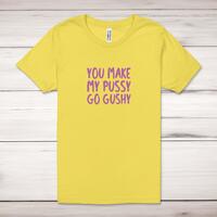 You Make My Pussy Go Gushy Adult T-ShirtA rude unisex adult t-shirt with 'You Make My Pussy Go Gushy' printed across the front of a 100% cotton* t-shirt. This rude t-shirt is great as a gift for any occasion.All of our unisex adult t-shirts are designed and hand-printed in the UK and are manufactured from 100% ringspun cotton for a premium quality feel and feature double-stitched waist hem and sleeves, seamless double-needle collar, taped neck and shoulders, and a tubular body that has been quarter turned to avoid a centre crease; available in sizes from Extra Small to 4XL*. *Black & White tees available in sizes XS - 4XL, all other colours available XS - 2XL Size GuideUnisex adult t-shirts are measured across the chest, in inchesXS 30/32'S 34/36'M 38/40'L 42/44'XL 46/48'2XL 50/52'3XL 54/56'4XL 58/60'See more on our clothing size guide (opens in new tab)Please NoteAll of our items are hand-printed to order, as a result, colours may vary between prints - images are for illustration purposes only.Show more products with the You Make My design